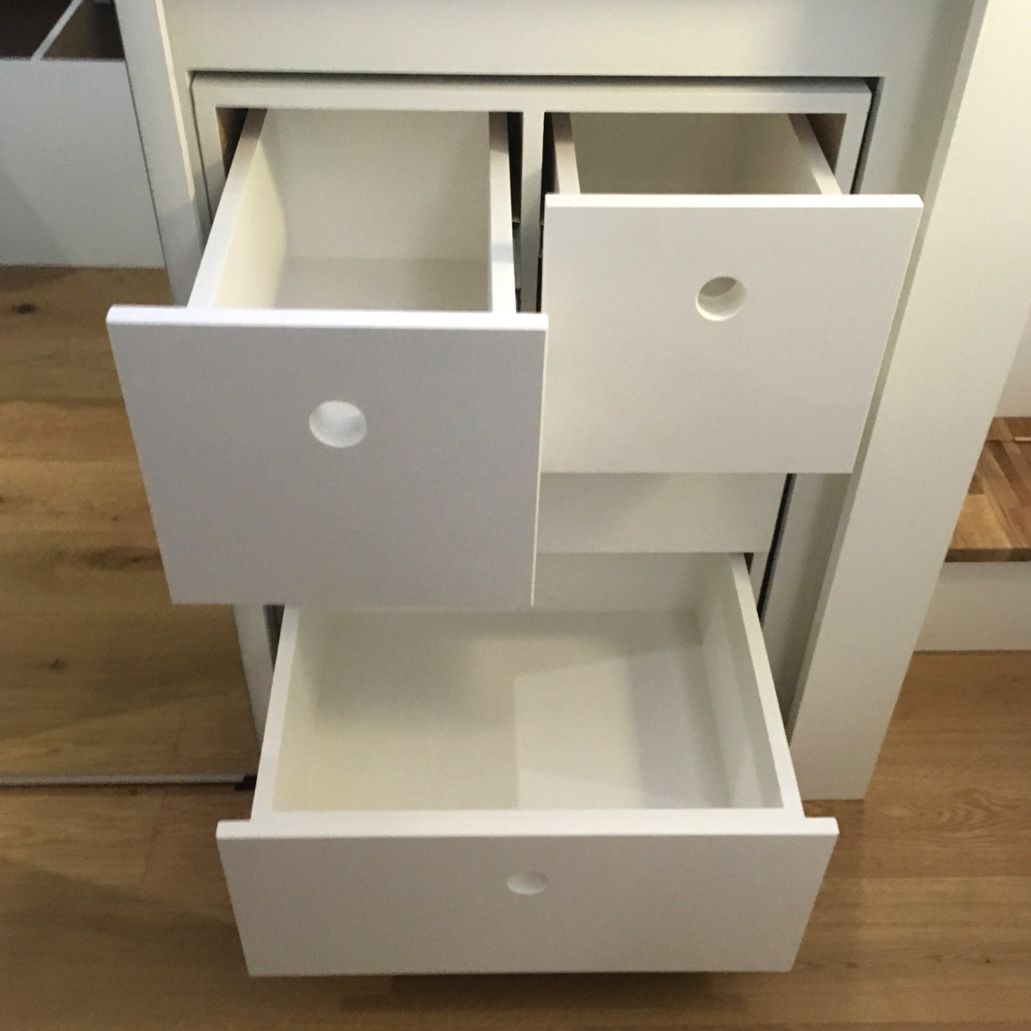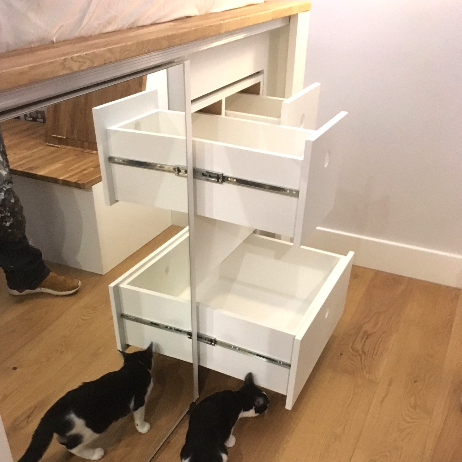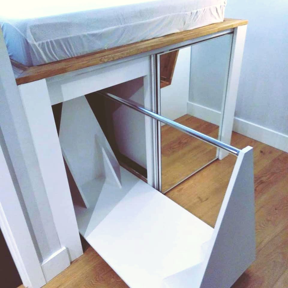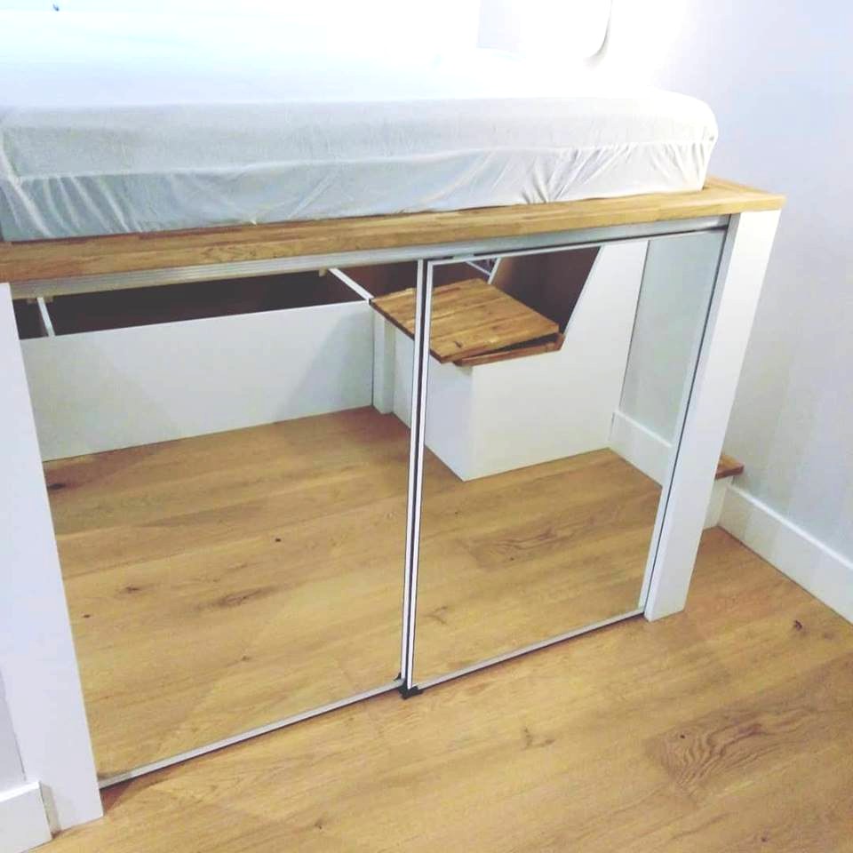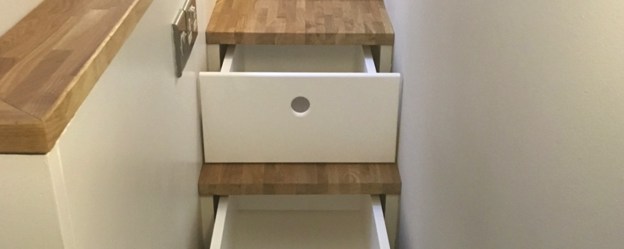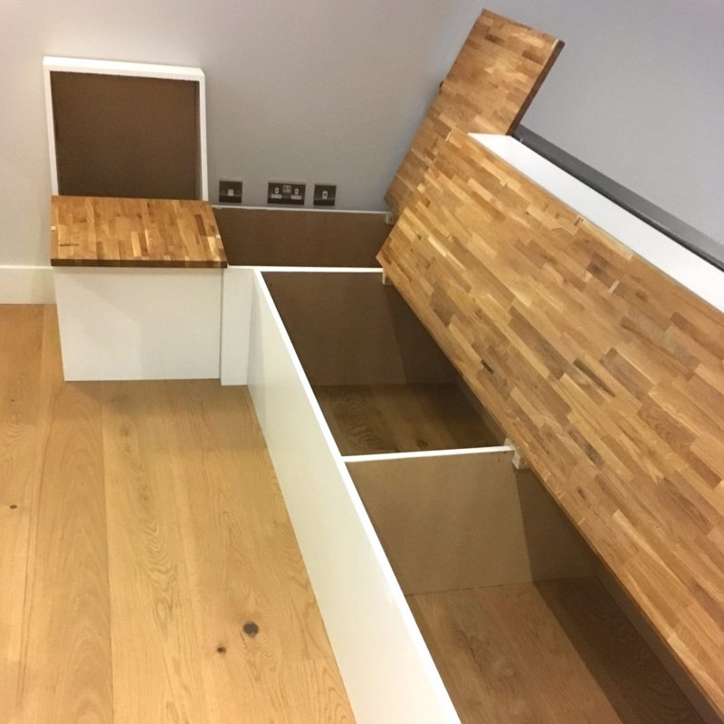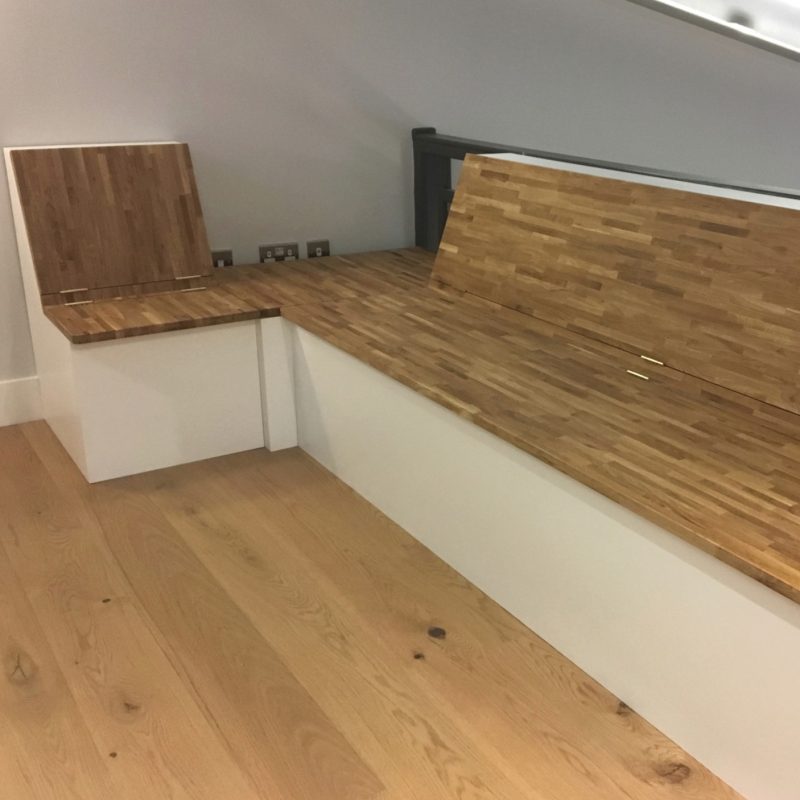 We were really pleased with the result. The cubby holes behind and under the stairs, the handy electric sockets, sliding mirrors to reveal drawers on one side and a 1.5 metre long hanging rail on wheels. Plus the ability to further use the space right at the back under the bed for long term storage. The benches were built so the backs fold down, and the seats lift up, creating a cosy and practical seating area in what would have been a tricky space to furnish.
