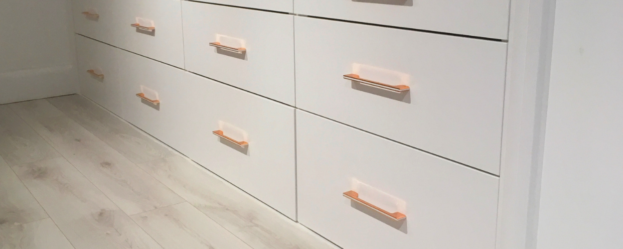 We worked with them to design the perfect space to organise their clothes and belongings, including almost five metres of hanging space, cladded cupboards with lighting, and a big set of drawers under the eves with beautiful copper handles to finish.